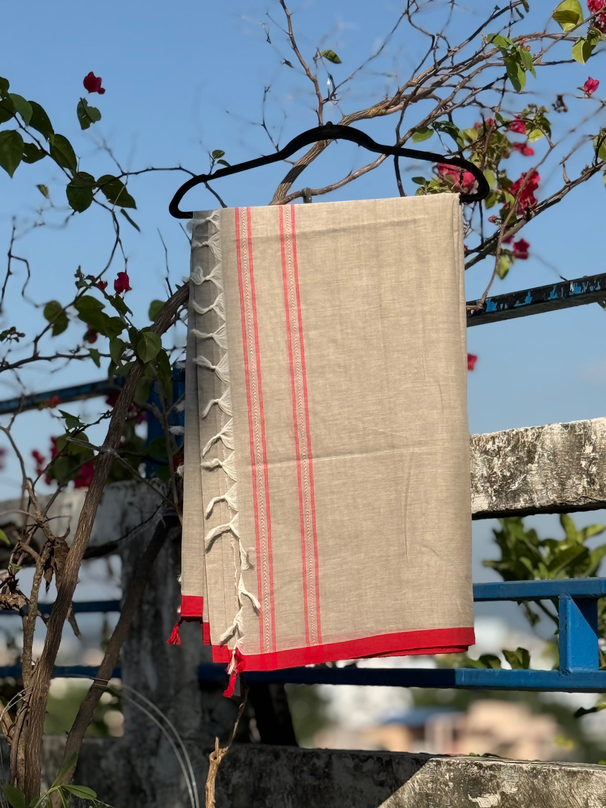 A rich red border runs along the edges, introducing a confident contrast to the understated body. The pairing feels timeless and assured, like a classic accent against a neutral canvas. Light, airy, and naturally soft on the skin, this saree is designed for days that value comfort and moments that speak without excess.